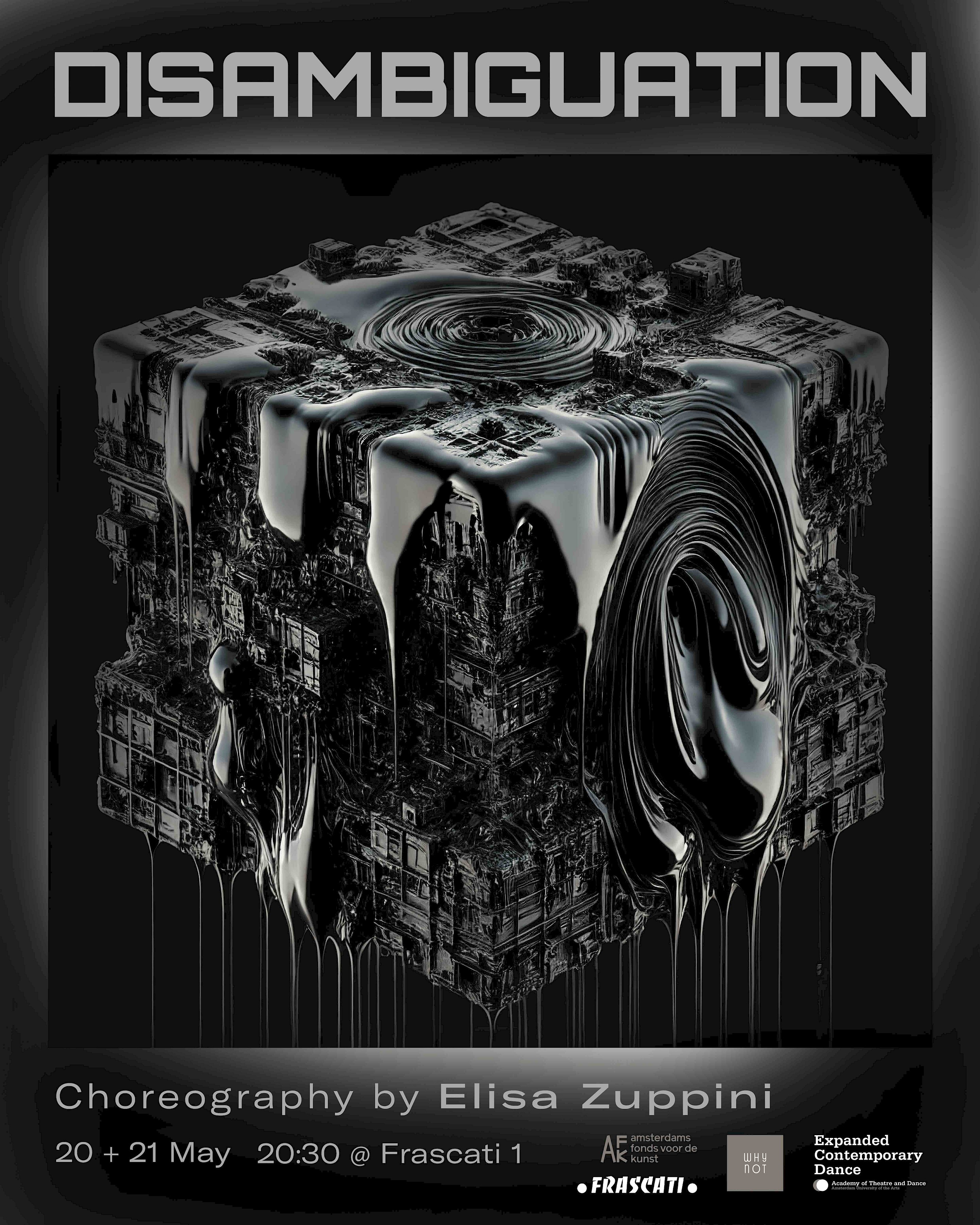 Concept and choreography: Elisa Zuppini | creation in collaboration with the performers: Hannah Badura, Rowan van den Boomen, Tim Brügger, Harvey Burke-Hamilton, Lola Dupriez, Mandisa Gramelsberger, Katrina Gusca, Jieon Ko, Ana Longo Nsame, Maxine van Lishoet, Clémence Masakidi, Esteban Alejandro Obregon Moriano, Envel Serazin, Jentel Schiettekatte, Ditte Toppet | Dramaturgy: Bruno Listopad | Supervisor sound editor: Fabian Reichle featuring original tracks by Lotic and BFRND | Costumes: Elisa Zuppini and Bruno Listopad | Lighting design: Martijn Smolders | Technic and lighting design contribution: Martin Kaffarnik | Producer: Charlot Van Der Meer | Graphic design poster: Bruno Listopad and Tea Teearu | Developed with the support of AFK (Amsterdam Funds for the Arts) co-produced by Expanded Contemporary Dance and WhyNot | Research presentation platforms: Amsterdam University of the Arts (June 2024); FLAM Festival with Museumnacht (November 2024, Amsterdam) | Thanks to the performers, Bruno Listopad, Bojana Bauer, Belle de Wit, Marjolein Vogels, Jacuzzi, Maria Ines Villasmil-Prieto, Gideon Poirier, Rose Akras, Tea Teearu, Zeynep Guntur | Photography: Sjoerd Derine (Amsterdam University of the Arts, June 2024); Thiemi Higashi (FLAM Festival with Museumnacht, November 2024, Amsterdam).